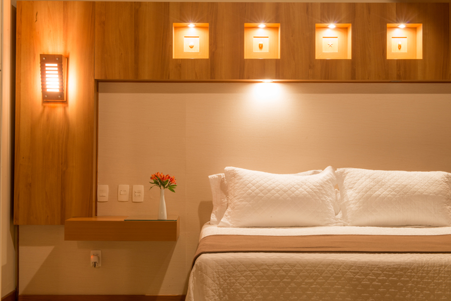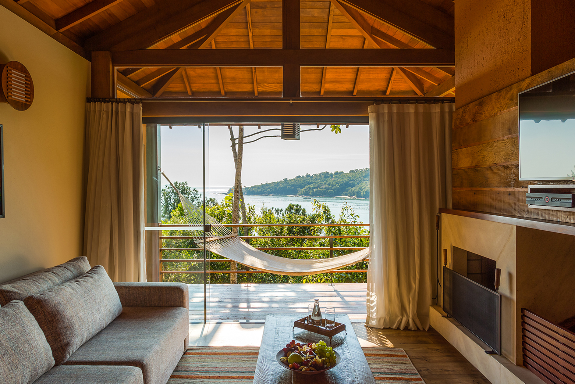 Integrados em um mesmo ambiente, dois níveis comportam uma ampla sala e quarto com decoração clean e cama de casal. Com aproximadamente 80m², o ambiente é funcional, leve e arejado sem perder o aconchego. Desfrute ainda de dois decks com vista para o mar da Costa Esmeralda.
