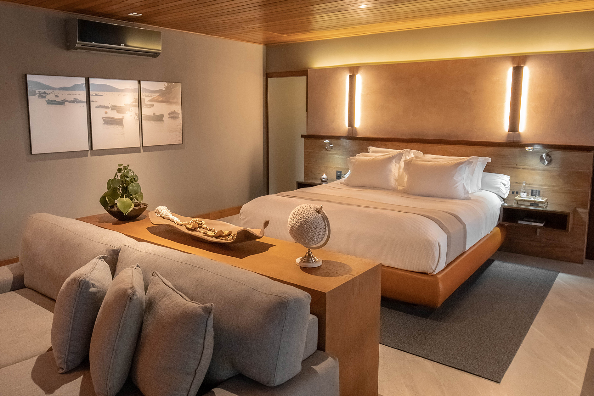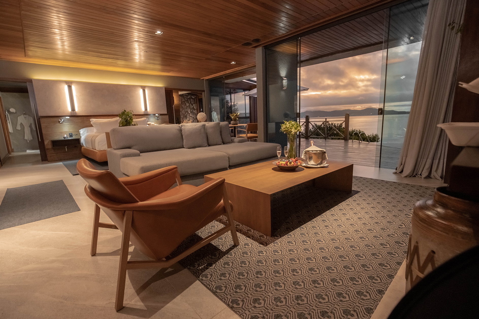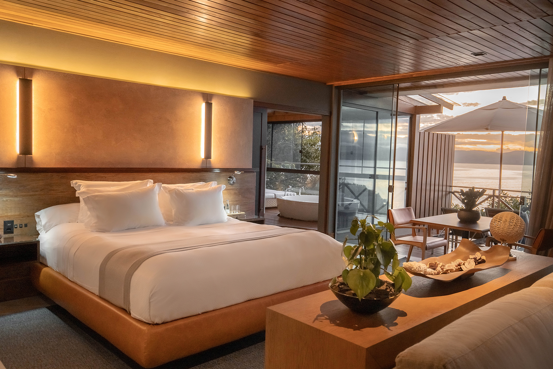 Recién reformado, el Bungalow Esmeralda, con aproximadamente 230 m², ofrece habitación y sala totalmente integrados y separados del área externa por una extensa puerta de vidrio. El ambiente incluye sauna seca con vista al mar, un baño spa, bañera de hidromasajes también con vista al mar y una agradable chimenea para los días de frío. Una deliciosa y hermosa área externa, deck privado con confortables Chaise Longues y una piscina climatizada. Toques extras incluyen sábanas de algodón egipcio 600 hilos y bodega para vinos.