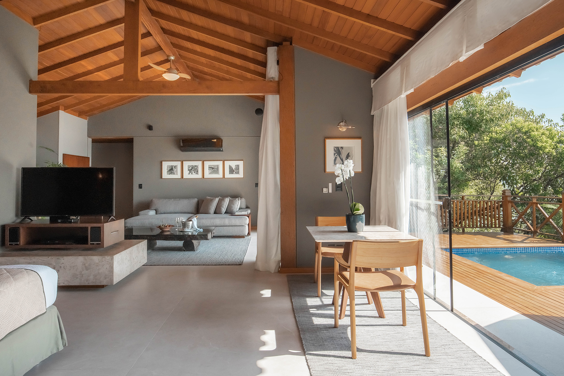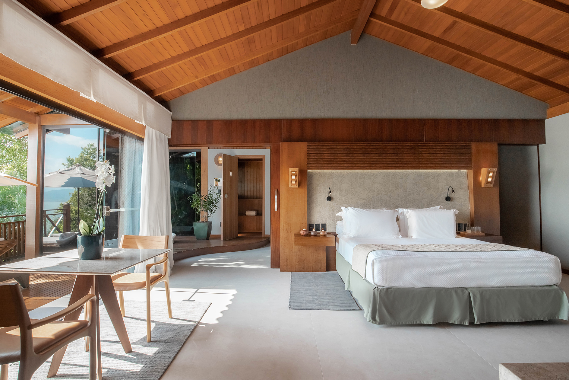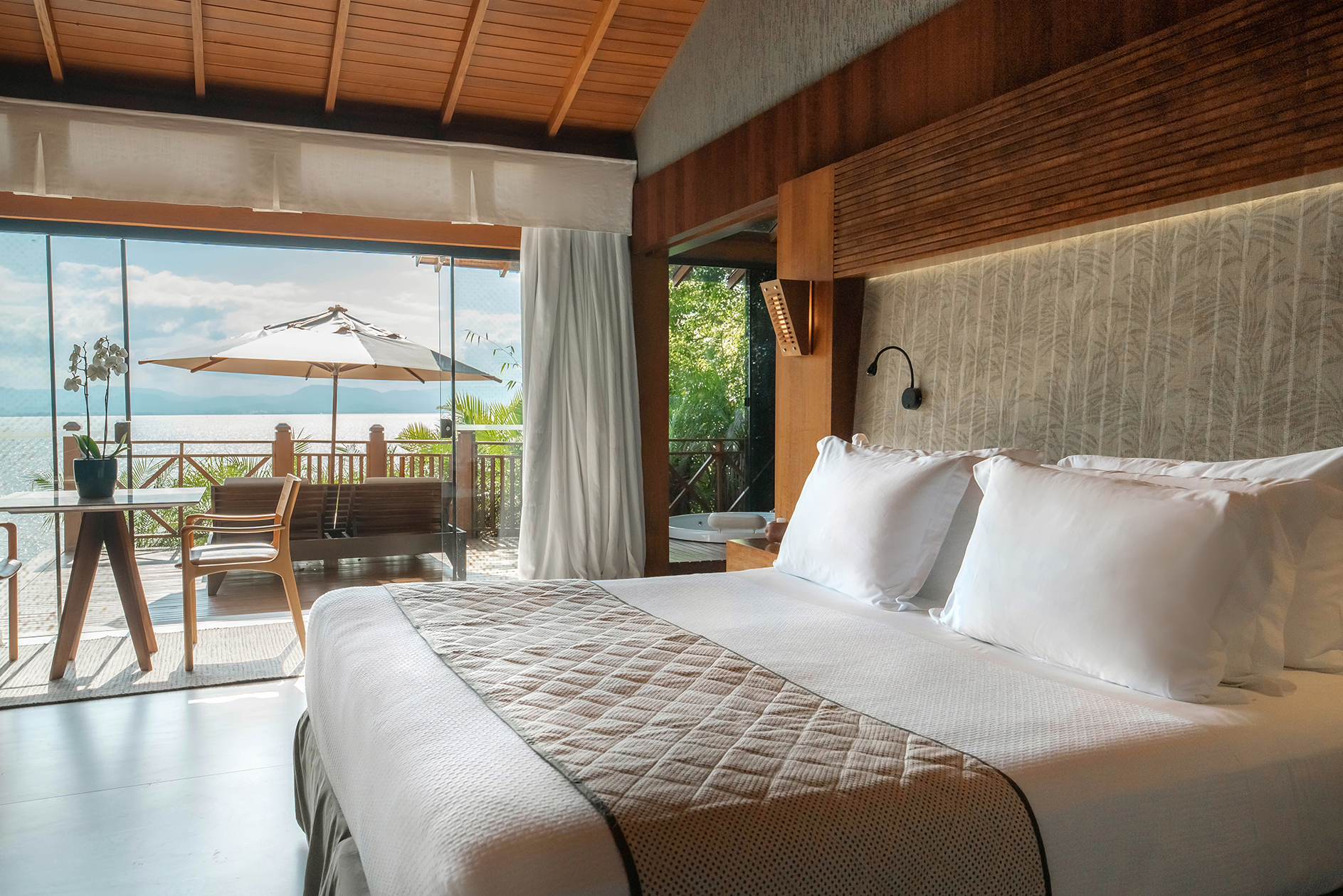 Recién reformado y con aproximadamente 180m², el bungalow ofrece habitación y sala integrados en un ambiente moderno y exclusivo. La decoración clean deja marcado una suavidad y sofisticación en los pequeños detalles. Toques extras incluyen sábanas de algodón egipcio 600 hilos. La iluminación fue proyectada para brindarle al huésped un contacto único con la naturaleza. En el área externa, un balcón amplio de madera con una vista increíble de toda la Costa Esmeralda. Es posible observar desde la isleta al frente de la playa hasta la villa de pescadores de los Ganchos do Meio. La puesta del sol es imperdible.